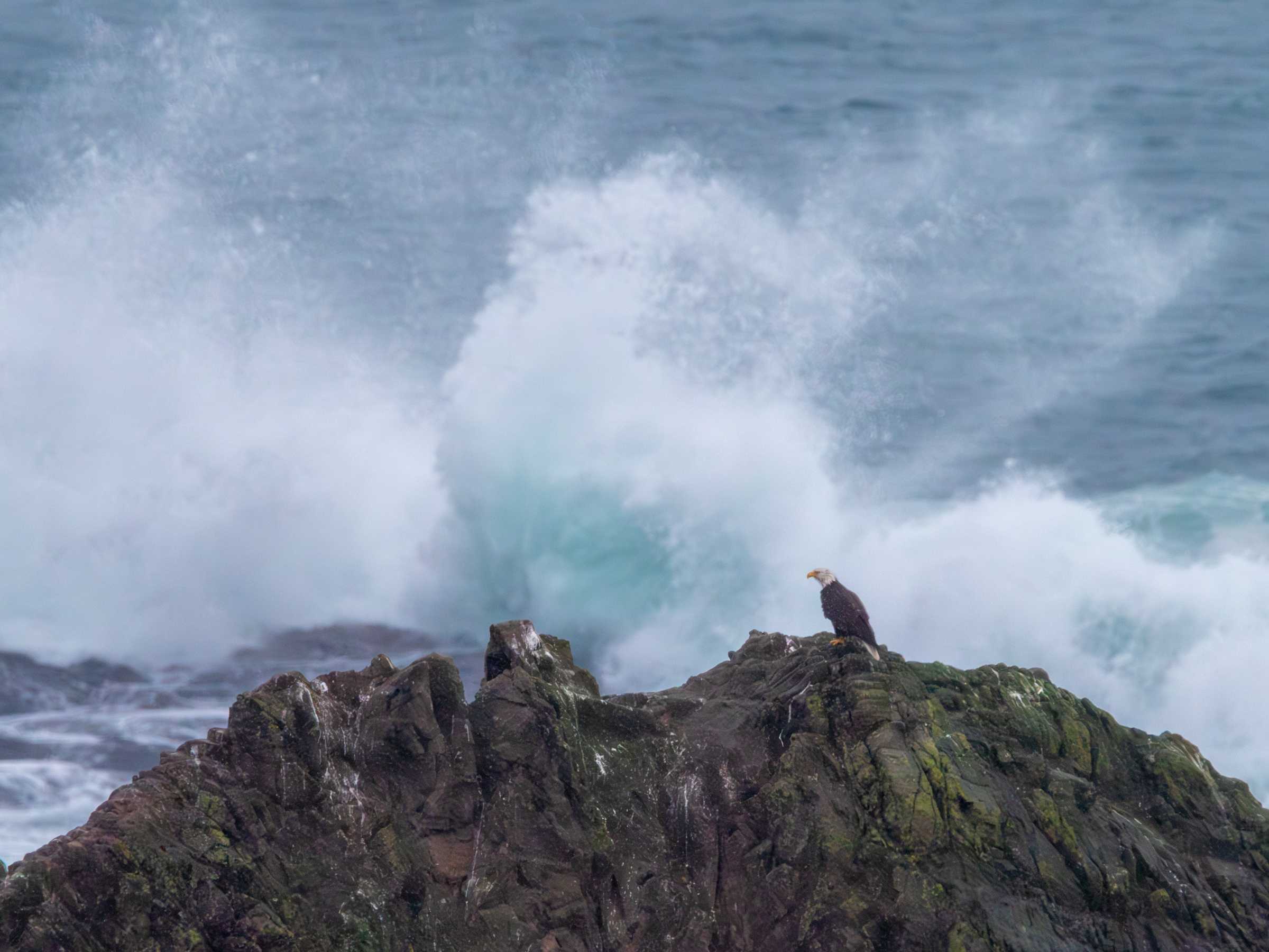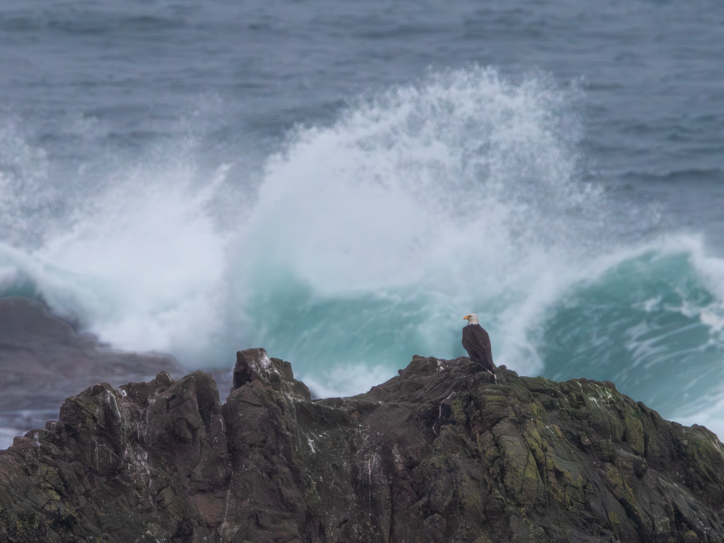 After a few minutes of looking around the area, I heard my son say, “Dad, there’s a huge bird out there on the rock. I think it’s an eagle!” I grabbed the small binoculars I keep in the car to get a good look at whatever he had spotted. Sure enough, there was a bald eagle perched on top of the largest rock overlooking the beach where the sea lions typically gather. I ran back to the car, grabbed my longest lens, a 1.4x teleconverter, and my Lumix GH4 camera (the 2x crop factor of the micro fourth thirds sensor would give a longer reach than the full frame sensor of my Canon R6 mark II).