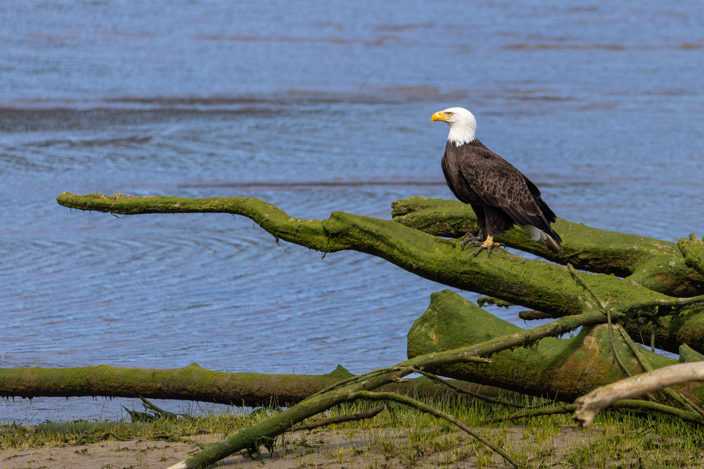 This April, I again had an opportunity to drive up the Umpqua River to see if any eagles might be seen in that same spot. When I first drove by, there was no sign of them. On the way back down the river, however, there was a bald eagle perched on a moss covered fallen tree. Of course, I pulled over again, hoping the bird would stick around long enough for me to capture a few photos.