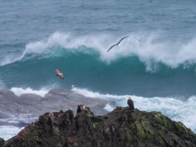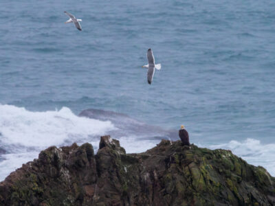 As you can see in the photos, below, the weather added to the challenge of getting any sharp images. Still, the storminess of the day, the large waves, and the eagle’s interactions with the seagulls made for some good drama.